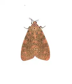 It differs from the much more widely distributed species Mangina argus in that the head, thorax and forewings are pale pinkish brown. Its spots are larger and more prominent, where those on the forewing being placed on clouded fuscous bands. The abdomen and hindwings are crimson. Its larva is purplish-grey with sparse hairs. A series of black dorsal transverse bands and lateral spots are present. Its head is red. The pupa is in a thin network cocoon.[3][4]