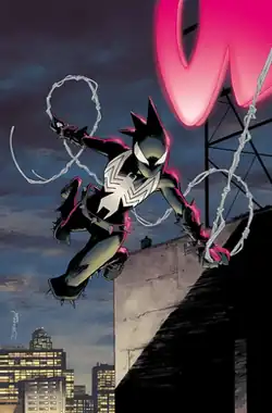 After losing the Scream symbiote because of the Carnage symbiote,[18] Andi is in Alchemax's custody before being killed by Phage,[19] but is revived when the symbiote remnants of Scream and the samples of the Anti-Venom symbiote merge to form Silence.[20] In this form, Andi teams up with Flash and Toxin to stop a conspiracy, where the symbiotes disrupt the Friends of Humanity.[21][22][23][24]