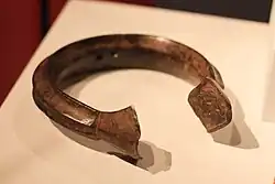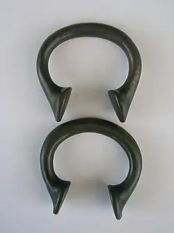 Manillas are a form of commodity money, usually made of brass, bronze, or copper, which were used in West Africa.[1] They were produced in large numbers in a wide range of designs, sizes, and weights. Originating before the colonial period, perhaps as the result of trade with the Portuguese Empire, manillas continued to serve as money and decorative objects until the late 1940s and are still sometimes used as decoration on arms, legs and around the neck. In popular culture, they are particularly associated with the Atlantic slave trade.[2]