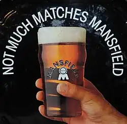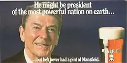 In the 1980s, Mansfield Bitter was advertised with a photograph of then US President Ronald Reagan and the tagline: "He might be president of the most powerful nation on earth... but he's never had a pint of Mansfield."[10][11] "Not much matches Mansfield" was also used and became the title for a play set in the town, written by Kevin Fegan for the Mansfield Arts Festival.[12][13][14] A similar 1989 advert contained the wording "He might be the life and soul of the Party...But he's never had a pint of Mansfield." featured Mikhail Gorbachev, then president of the Soviet Union.[15]