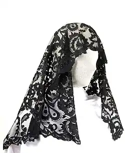 A mantilla is a traditional female liturgical lace or silk veil or shawl worn over the head and shoulders, often over a high hair ornament called a peineta, particularly popular with women in Spain and Latin America.[1] Within Christendom, it is worn by Catholic and Plymouth Brethren women around the world, Mennonite women in Argentina, and without the peineta by Eastern Orthodox women in Russia. When worn by Eastern Orthodox women the mantilla is often white, and is worn with the ends crossed over the neck and draped over the opposite shoulder. The mantilla is worn as a Christian headcovering by women during church services, as well as during special occasions.[2][3] A smaller version of the mantilla is called a toquilla.[4]