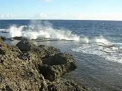 The Mapu a Vaea or "Whistle of the Noble" are natural blowholes on the island of Tongatapu in the village of Houma in the Kingdom of Tonga.[1] When waves crash into the reef, natural channels in the volcanic rock allow water to forcefully blow through and create a plume-like effect. It is one of the highlights of the tours around the island of Tongatapu.[2][3] "Vaea" is the name of the Honorable Vaea Family of nearby Houma.
