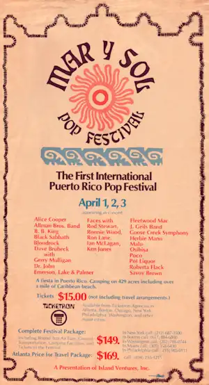 The Mar y Sol Pop Festival (also referred to as Mar y Sol Festival or simply Mar y Sol – Sea and Sun) was a rock festival that took place in Manatí, Puerto Rico, about thirty miles west of San Juan, on April 1–4, 1972. It was held on 420 acres (1.7 km2) of countryside adjacent to Los Tubos beach in Manatí on the north shore of the island. An estimated 30–35,000 people attended the festival.[1][2]