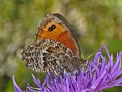 E goante Esp (= scaea Hbn.) (37 c). Upperside marked as in nerine, but the ocelli as rule somewhat smaller and the hindwing of the female more distinctly dentate. The band of the forewing narrows posteriorly, being bright russet in the male and light russet-yellow in the female. There are 2 united, white centred, black ocelli near the apex of the forewing, and above them there is sometimes a black ocelliform dot which has but rarely a pupil. Towards the hindmargin there is a further small ocellus, which has occasionally a white centre. In the somewhat narrower distal band of the liindwing there are 3 rarely 4, white-centred black ocelli. The underside of the forewing russet-brown, lighter in the female, with black-brown margin, the apex being dusted with white-grey. Underside of the hindwing black-brown, marmorated with white-grey; the strongly dentate central band is externally bordered by a band-like line which consists of an accumulation of white scales and is here and there interrupted; towards the distal margin there are 3-4 white-centred black eye-dots. The female is throughout lighter in colour, the ocelli being larger. The underside of the hindwing is white-grey, thinly dusted with brown atoms, the veins being sparsely scaled white. The distal margin of the male somewhat lighter than the ground-colour, being chequered brown and white in the female. — In the Alps, in the mountain-and subalpine region, [in the High Tatra and the Carpathian Mts.; in the West Pyrenees as a small form which has been figured by Herrich-Schaeffer as gorgone not included in the distribution as now understood misident. ?]. The butterfly flies in July and August in dry and stony localities, and likes to settle with the wings half open on rocks.[5]