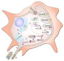 The most abundant protein produced is the nucleoprotein, whose concentration in the cell determines when L switches from gene transcription to genome replication. Replication results in full-length, positive-stranded antigenomes that are in turn transcribed into negative-stranded virus progeny genome copies. Newly synthesized structural proteins and genomes self-assemble and accumulate near the inside of the cell membrane. Virions bud off from the cell, gaining their envelopes from the cellular membrane they bud from. The mature progeny particles then infect other cells to repeat the cycle.[14]