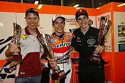 Tito Rabat celebrating winning his home GP in Barcelona with fellow Catalan winners of the other classes, brothers Álex and Marc Márquez, en route to his 2014 Moto2 championship