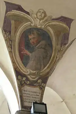 As a theologian, Cardinal Vigerio wrote many works on the life, death, and resurrection of Jesus Christ, as well as works on Jesus' shroud and the spear of Longinus.[1] His theology is thought to have influenced Raphael's famous painting Disputation of the Holy Sacrament; the cardinal appears on the right of the painting, with the Franciscan habit and a cardinal's hat.[1]