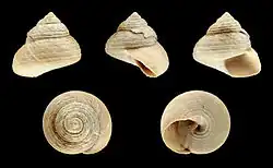 | Five views of a shell of Margarites pupillus | |