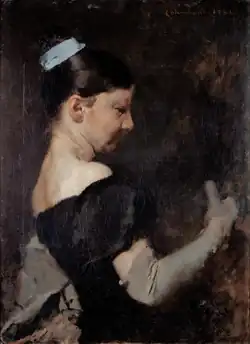 Thanks to her close relationship with her brother, Columbano, who created several portraits of her, she accompanied him on a study trip to Paris in 1881 and became a member of the Portuguese art association Grupo do Leão (Lion's Group) in 1885.[2] As a painter, she specialized in watercolours of flowers, especially chrysanthemums and roses, and frequently participated in exhibitions at the Sociedade Promotora de Belas-Artes. She was also a keen craftswomen, decorating earthenware and, in particular, working with lace.[2][1]