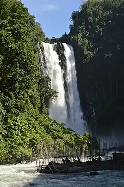 Maria Cristina Falls is a waterfall of the Agus River in the Northern Mindanao region of the Philippines. It is sometimes called the "twin falls" as the flow is separated by a rock at the brink of the waterfall.[1] The name come from the Spanish queen, Maria Christina of Austria. It is located 9.3 kilometers away southwest of Iligan City at the boundaries of Barangays Maria Cristina, Ditucalan, and Buru-un.[2] Known for its natural grandeur, the 321.5 feet (98.0 meters) high waterfall[3] is also the primary source of electric power for the city's industries, being harnessed by the Agus VI Hydroelectric Plant.[4]