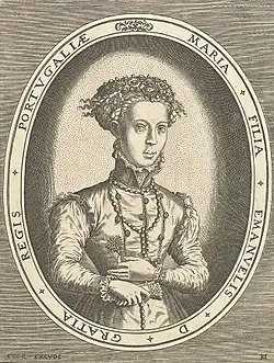Maria, Duchess of Viseu (18 June 1521 – 10 October 1577; Portuguese pronunciation: [mɐˈɾiɐ]) was an infanta of Portugal, the only daughter of King Manuel I of Portugal and his third wife, Eleanor of Austria. A noted patron of the arts and buildings, Maria's personal wealth rivaled that of her half-brother, King John III of Portugal, making her the richest woman in Portugal and one of the wealthiest princesses in Europe.