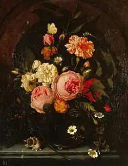 Sometime in the early to mid-1670s, she moved to Amsterdam,[3] where her studio was opposite the workshop of fellow flower painter Willem van Aelst.[4] Van Aelst courted her, but she refused his hand, and he reportedly stopped pursuing her because her devotion to painting was more important to her.[1][5] Van Oosterwijck remained single throughout her life, but raised her nephew, who had been orphaned.[3]
