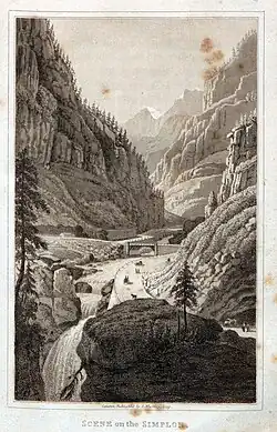 Early in 1818, the Baillies found a "shelter" and a "calm retreat" at Twickenham, where they received kindness from Lady Howe, whose second husband, Sir Wathen Waller, would seem to have been a relative of Mrs. Baillie. It was from Twickenham that the Baillies set out for a continental tour, crossing the Channel from Dover to Calais on 9 August 1818, and returning 8 October following. The literary result of this journey appeared in a volume inscribed by the author to the Right Hon. John Trevor, who had been British minister at Turin from 1783 to 1798; of whom Mrs. Baillie spoke after his death as a "paternal friend".[5] The title of the volume was First Impressions on a Tour upon the Continent in the Summer of 1818, through Parts of France, Italy, Switzerland, the Borders of Germany, and a Part of French Flanders, 8vo, London, 1819. In the same year Mrs. Baillie wrote a poetical Farewell to Twickenham.[4]