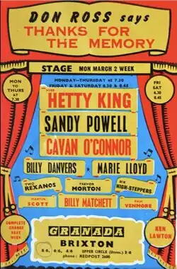During the 1960s, she toured in Thanks for the Memory for Don Ross, a nostalgic revival of music hall entertainment first staged in 1947.[4] She also appeared in the act The Lloyd Family with her aunts Rosie, Daisy and Alice Lloyd, singing songs they and Marie Lloyd had made famous.
