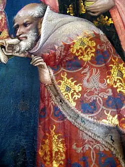 The pattern on the fabric is created by applying a layer of gold or silver to the chalk base, which is then painted over. When the garment is finished, the ornaments are scraped from the top layer of paint. Linear embossing mimics the texture of the fabric. The folds in the robes are not followed by the brocade patterns. They are executed over the entire surface without optical foreshortening; the impression of pleating the fabric is achieved here only through colored glazes.[17]