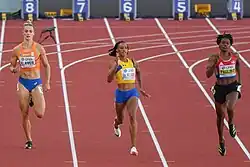 She traveled to the World Championships instead of pursuing a medal, hoping to make the qualifying marks for the 2020 Olympics.[74] She represented her country taking part of the 200 metres competition and had a faster looser qualifier with a 23.04 mark in the first round,[75][76] and a season best of 23.03 in the semifinals, not qualifying for the finals.[77][78]