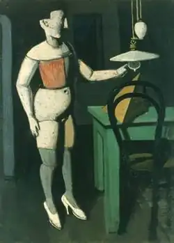 Sironi served in World War I as a member of the Lombard Volunteer Cyclists and Drivers.[5] After the war, he abandoned Futurism and developed a style that emphasized massive, immobile forms. In paintings such as La Lampada of 1919 (Pinacoteca di Brera, Milan), mannequins substitute for figures, as in the metaphysical paintings of Giorgio de Chirico and Carlo Carrà. In 1922, Sironi was one of the founders of the Novecento Italiano movement, which was part of the return to order in European art during the post-war period. Paintings such as Venere of 1921–1923 (Galleria Civica d'Arte Moderna, Turin) and Solitudine ("Solitude", 1925; Galleria Nazionale d'Arte Moderna, Rome), with their contained, geometric forms, bear some kinship to the Neoclassicism evident in works produced at the same time by Picasso.[6]