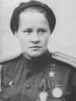 Later on during the Lvov-Sandomierz offensive, she sustained a severe concussion that left her speech impaired for a while; she was transferred away from the warfront after the injury. In November 1944 she married an artillery officer by the name of Aleksandr Demidov, and subsequently took his surname. From July to September 1944 she worked in the Komsomol political division of the Leningrad Air Defense Army, and then worked as the assistant chief of the 22nd Karelian district political department until February 1945. That year she was demobilized due to her poor health, caused by numerous wounds sustained in the war. Throughout the war, she was deployed on the Northwest, Stalingrad, 4th Ukrainian, and 1st Ukrainian fronts, seeing combat in the battles for Bereznegovatoye–Snigirevka, Demyan, Lvov-Sandomierz, Melitopol, Nikopol-Krivoy Rog, Odessa, Rostov, and Stalingrad.[3][4]