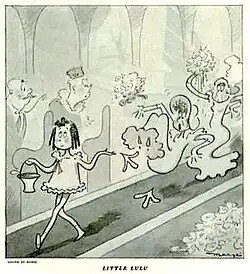 In 1934, The Saturday Evening Post requested Buell to create a strip to replace Carl Anderson's Henry.[4] Buell created a little girl character in place of Henry's little boy as she believed "a girl could get away with more fresh stunts that in a boy would seem boorish". The first single-panel installment ran in the Post on February 23, 1935; in it, Lulu appears as a flower girl at a wedding and strews the aisle with banana peels. The single-panel strip continued in the Post until the December 30, 1944, issue, and continued from then as a regular comic strip.[5] Buell retained the rights, unusual for the time. Buell marketed Little Lulu widely throughout the 1940s. Buell herself ceased drawing the strip in 1947, and in 1950 Little Lulu became a daily syndicated by Chicago Tribune–New York News Syndicate and ran until 1969.[6] After she stopped drawing the strip, Buell herself drew Lulu only for the lucrative Kleenex advertisements.[7]