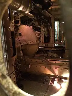 The use of Wilson's epicyclic steering gear in the Mark V meant that the driver could control all aspects of the transmission: three extra crew members had been required in previous versions of the tank, two gearsmen to change low and high gears on either side of the tank, and the commander who operated the brakes and skid steering.[8] There was much more space at the rear after the removal of the massive differential gear (originally designed for the Daimler-Foster agricultural tractor) fitted to all the earlier tanks. On the roof towards the rear of the tank, behind the engine, was a second raised cabin, with hinged sides that allowed the crew to attach the unditching beam without exiting the vehicle. An additional machine-gun mount was fitted at the rear of the hull.[5][10]