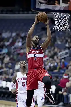 On February 18, 2016, Morris was traded to the Washington Wizards in exchange for DeJuan Blair, Kris Humphries and a 2016 Top–9 protected first round draft pick.[36] The next day, he made his debut for the Wizards in a 98–86 victory over his brother's team, the Detroit Pistons, recording six points and two rebounds in 22 minutes.[37] On February 29, 2016, Morris recorded his first double-double as a Wizard with 16 points and 13 rebounds in a 116–108 win over the Philadelphia 76ers.[38]