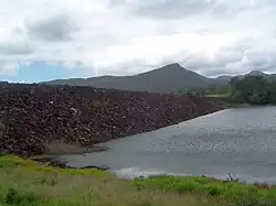 Construction of the dam commenced in 1969 and was completed in 1973. The rock and earthfill dam structure is 46.3 metres (152 ft) high and 451 metres (1,480 ft) long. The 1,620-thousand-cubic-metre (57×106 cu ft) dam wall holds back the 44,300-megalitre (9.7×109 imp gal; 1.17×1010 US gal) reservoir when at full capacity. The dam has a clearance of 10.4 metres (34 ft) above full supply level for flood mitigation purposes. This allows for a full operating level at 37,100 megalitres (8.2×109 imp gal; 9.8×109 US gal).[5] From a catchment area of 160 square kilometres (62 sq mi) that lies within the Scenic Rim at the foot of the McPherson Range, the dam creates an unnamed reservoir, with a surface area of 310 hectares (770 acres). The uncontrolled un-gated spillway has a discharge capacity of 567 cubic metres per second (20,000 cu ft/s),[1] and is situated 43.9 metres (144 ft) above the original stream bed. Initially managed by the SunWater, management of the dam was transferred to Seqwater in July 2008.