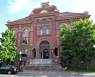 The Marquette City Hall is a three-story rectangular building, measuring 92 by 72 feet (28 by 22 m),[4] combining Richardsonian Romanesque, Second Empire, and Renaissance Revival architectural elements. It is constructed of red brick on a raised sandstone foundation, and surmounted by a tiled Mansard roof with a cupola. The front facade is divided by quoins into five bays. The central bay contains a recessed entrance, while the remaining front bays contain two-story arched windows. The remaining sides of the structure contain ribbon windows.[2]