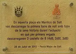 In 2002, the city council of Girona placed a plate in Plaça del Vi to commemorate the 4 in 8 and the crowned 3 in 8 of the performance of Sant Narcís the previous.[85] In 2002, the city council of Salt placed a plate in Lluís Companys square to commemorate the first tower of eight level ever completed in the village.[86] On 27 April 2014, matching the performance of the 18 years of the group, the city council of Salt, added another plate to commemorate the first performance of Marrecs with three completed towers of eight levels, which happened 28 July 2013.[86]