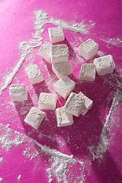 Whether used for candy or medicine, the manufacture of marshmallows was limited to a small scale. In the early to mid-19th century, the marshmallow had made its way to France, where confectioners augmented the plant's traditional medicinal value. Owners of small confectionery stores would whip the sap from the mallow root into a fluffy candy mold. This candy, called Pâte de Guimauve, was a spongy-soft dessert made from whipping dried marshmallow roots with sugar, water, and egg whites.[7][8] It was sold in bar form as a lozenge. Drying and preparation of the marshmallow took one to two days before the final product was produced.[9] In the late 19th century, candy makers started looking for a new process and discovered the starch mogul system, in which trays of modified corn starch had a mold firmly pushed down in them to create cavities within the starch. The cavities were then filled with the whipped marshmallow sap mixture and allowed to cool or harden.[10] At the same time, candy makers began to replace the mallow root with gelatin, which created a stable form of marshmallow.[5]