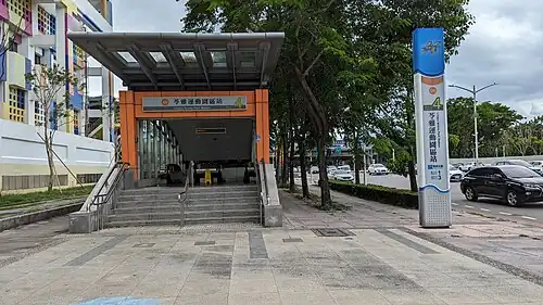 The station is a two-level, underground station with an island platform and four exits.[2] The station is 201 meters long and is located on Jhongjheng 1st Rd across from Martial Art Stadium, other sporting facilities nearby include the Olympic Pool, Sports Stadium and Extreme Sports Arena.[3]