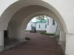 The building was erected in 1913-1917 to resemble an Old Russian fort and contain a museum of Russian military history, so in 1914 it was given a medieval-sounding name Rus. Gosudareva Ratnaya palata (The Sovereign's Martial Chamber).[12] Its architect was Semyon Sidorchuk.[14] For the holding of the museum's collections were allocated a one-story well-lit gallery and the two smaller towers.[12] The third, larger tower was to contain bulky exhibits.[12] The two-story great hall was intended as a 400-seat lecture room and film demonstration auditorium.[12] During World War I the museum received portraits of the first Russian soldiers awarded with St George's Cross in this war.[12] Various war trophies were brought here from battlefields, such as captured enemy weapons and equipment.[12] Large cannons and even an airplane were placed in the inner courtyard. [12]