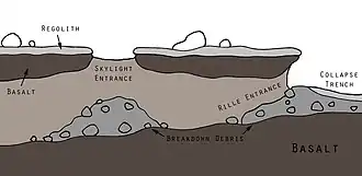 There has been increased interest in the identification and investigation of lava tubes because they could present scientists with information regarding the geological, paleohydrological, and supposed biological histories of the planet.[5] When speaking about lunar lava tubes, Dr. William "Red" Whittaker, CEO of Astrobotic Technology, states that "something so unique about the lava tubes is that they are the one destination that combines the trifecta of science, exploration, and resources."[6] Access to uncollapsed sections of lava tubes can be done by entering at the end of rille, through skylights, or by drilling or blasting through the roof of a lava tube.[3] Initial exploration of lava tubes may involve rovers, but with difficult challenges. Traditional skylights have large rubble piles directly below them (as seen in the first figure) which would be an obstacle for the rover. The vertical drop that the rover would have to perform would also have to be taken into consideration, as well as the ability of the rover to remain in communication with assets at the surface or in orbit.[7]