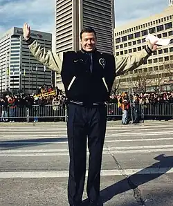 O'Malley announced his decision to run for Mayor of Baltimore in 1999, after incumbent Kurt Schmoke decided not to seek re-election to a third term.[23] His entrance into the race was greatly unexpected,[24] and he faced initial difficulties as the only white candidate for mayor of a city which had been predominantly African-American since the 1960 Census and had recently had two successive black mayors.[25] His strongest opponents in the crowded Democratic primary of seven were former City Councilman Carl Stokes, Baltimore Registrar of Wills Mary Conaway, and Council President Lawrence Bell.[26] In his campaign, O'Malley focused on reducing crime and received the endorsement of several key African-American lawmakers and church leaders, as well as that of former mayor of Baltimore and Maryland governor William Donald Schaefer, who had served from 1971 to 1987.[27] On September 14, he won the Democratic primary with a 53% majority[28] and went on to win the general election with 90% of the vote, defeating Republican Party nominee, developer David Tufaro.[29][30]