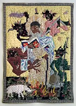 In common with many traditional and contemporary quiltmakers, Lamb constructed her quilts with secondhand fabrics, "anticipating the recycled-art movement," as one critic put it.[9] In time, she would become known for her eccentric choices of materials in creating "wry narratives that blended Christian symbolism with social comment," [10] her multileveled pictorial quilts "at once innocent and troubling, reverent and irreverent, serious and tongue-in cheek."[11] Lamb's first "religious" quilts impressed Rauschenberg by "the level of her craft, her vision, dealing with the religious imagery that can be traumatizing." He became a friend who championed and promoted her work throughout the rest of her life and after her death.[4]
