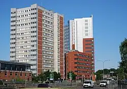 The Lee Bank area was designed in 1960 as a single unit by Birmingham's City Architect A.G. Sheppard Fidler.[4] These consisted of 6-8 storey, brick built structures, however, when landscape architect Mitchell was appointed to help in the design, taller twenty storey tower blocks were introduced.[5] The Lee Bank project was approved in stages between 1963 and 1967. It consisted of four 20 storey tower blocks, containing 464 flats, and one twelve storey tower block.[6]