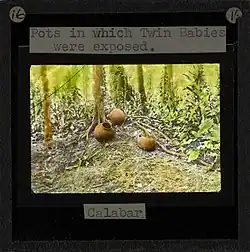It was the belief in the area that the birth of twins was considered a particularly evil curse. Natives feared that the father of one of the infants was a 'devil child', and that the mother had been guilty of a great sin. Unable to determine which twin was fathered by the evil spirit, the natives often abandoned both babies in clay pots to die. In most of Calabar the practice had been eliminated by the Missionaries and King Eyo Honesty II. Slessor left the area of Calabar and moved further in to Okoyong. She adopted every child she found abandoned, and sent out twins' missioners to find, protect and care for them at the Mission House. Some mission compounds were alive with babies.[2][3] Slessor once saved a pair of twins, a boy and a girl, but the boy did not survive. Mary took the girl as her daughter and called her Janie. She took Janie home to Scotland with her on at least one visit.