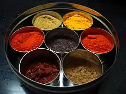 A typical masaladabbi has a number of small cups, often seven, placed inside a round or square box.[1] The modern boxes have transparent lids and display the contents inside. Usually a small spoon (approximately 1/2 teaspoon size) accompanies the box.[1] The most popular and daily usage spices like mustard, chili, garam masala, cumin, fenugreek, variety of masalas, ajwain (bishop's weed) etc. are stored in this box.