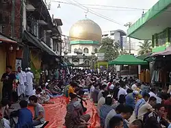 The Golden Mosque acquired its name for its gold-painted dome and its location on Globo de Oro Street. Under the supervision of Philippine's then-First Lady Imelda Marcos, construction began on August 4, 1976, for the visit of Libyan leader Muammar al-Gaddafi, although his visit was cancelled. It was funded through foreign donations, notably from Libya and Saudi Arabia.[1][2] It now serves many in Manila's Muslim community and is especially full during Jumuah prayers on a Friday. The mosque can accommodate up to 22,000 worshippers.[3]