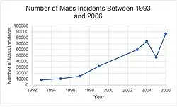 Within the past few decades, the number of mass incidents occurring in China has seen significant growth, indicated by The Annual Report of China's Rules (2009).[5] In more recent times the numbers have continued to be high yet are less documented making reliable statistics rare, however it is definite that the frequency of mass incidents has increased.[4]