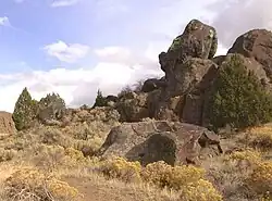 The park features a configuration of boulders along the south bank of the Snake River, known alternatively as Massacre Rocks, "Gate of Death", or "Devil's Gate". Settlers gave this name to the narrow passage of the trail through the rocks, from the fear of possible ambush by Native Americans. According to diaries of settlers, settlers in five wagons clashed with Shoshone just east of the rocks on August 9–10, 1862. At least eight settlers from four wagon trains died, with at least 20 Shoshone also killed.[4] The skirmishes took place east of the park and not at Devil's Gate as commonly believed. Some confrontations may have occurred there, but they remain unverified.[5] The Clark Massacre of 1851 occurred just west of Massacre Rocks, closer to the Raft River.