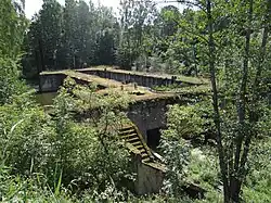 Works were finally abandoned in 1942.[4] The Polish–Soviet border agreement of August 1945 divided the course of the canal, with 20.43 kilometres (12.69 mi) assigned to Poland and 29.97 kilometres (18.62 mi) to the USSR.[4][18] After the Second World War, many of the mechanisms at the locks and weirs were looted.[19]