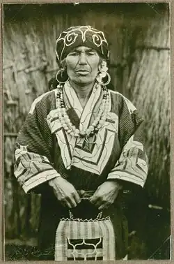 The Ainu have no recorded habit of tying their hair. Accordingly, both men and women regularly trimmed it so that it would not grow past their shoulders. In order to protect their hair from harsh elements during daily tasks such as housework and hunting, both sexes wore headbands - women wore a plain black cloth known as a "senkaki" (センカキ) around their head and tied it with a plain headband known as a "chepanup" (チェパヌㇷ゚), and men wore a matanpushi headband.[1] Gradually, towards the latter half of the Meiji era, women too began wearing the matanpushi, and the sapanpe replaced the matanpushi as the traditional headband for men.[2]
