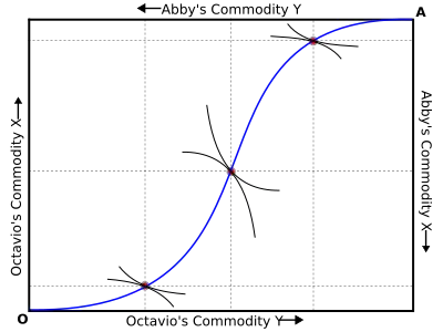 Given two individuals, the set of solutions where both individuals can maximize utility is described by the contract curve on what is now known as an Edgeworth Box. Technically, the construction of the two-person solution to Edgeworth's problem was not developed graphically until 1924 by Arthur Lyon Bowley.[34] The contract curve of the Edgeworth box (or more generally on any set of solutions to Edgeworth's problem for more actors) is referred to as the core of an economy.[35]