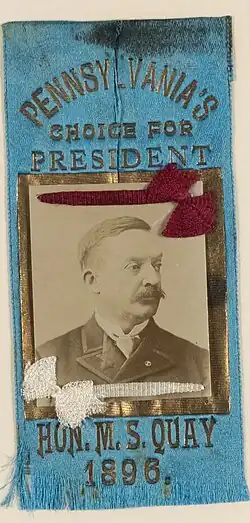 Matthew Stanley Quay (/kweɪ/; September 30, 1833 – May 28, 1904) was an American politician of the Republican Party who represented Pennsylvania in the United States Senate from 1887 until 1899 and from 1901 until his death in 1904. Quay's control of the Pennsylvania Republican political machine for almost twenty years made him one of the most powerful and influential politicians in the country. As chair of the Republican National Committee and thus party campaign manager, he helped elect Benjamin Harrison as president in 1888. He was also instrumental in the 1900 election of Theodore Roosevelt as vice president.