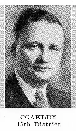 In the 1939 and 1941 sessions, Coakley served as Republican floor leader. During the 1939 session, the Republicans had 16 seats (one short of a majority), and Coakley became majority leader with the votes of six Democrats (the Democrats received some committee chairmanships); he would later recall, "When the Democrats voted with us that session, we could suspend the rules. When they didn't, we couldn't even pass a bill. We were between the door and the jamb a lot of time."[3]