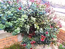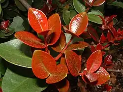 New growth is bright scarlet. Mature leaves are a very dark green and leathery in texture. The leaves are distinctively round. They grow in opposite pairs up the stem with a noticeable symmetry, each new pair perpendicular to the previous.