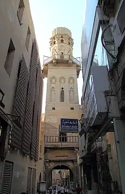 The Salihiyya Madrasa broke the Ayyubid tradition of only adding minarets to Friday mosques to call Muslims to prayer in that mosque.[7] The madrasa's minaret is positioned directly over the entrance of the madrasa. The structure has two shafts topped by ribbed helmet domes divided by a balcony and is known as a mabkhara ("incense burner.")[1] The lower shaft is rectangular and on each of its sides are three tall, recessed, keel-arched panels with ribbed hoods. Its upper shaft is octagonal in shape and also with keel-arched panels. Unlike its lower counterpart, however, it is a more open structure filled with lobe-arched windows. The bases of the minaret's domes are decorated by two bands of muqarnas.[1]