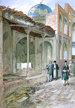 The tomb itself survived various calamities; including several major earthquakes,[3]: 68 raids by some Turkic tribes, and the Mongol invasion.[4] In the succeeding centuries, Omar's grave had become situated in an open wing of a shrine of a certain Islamic saint called Imamzadeh Muhammad Mahruk (d. eighth century), the brother of Reza. According to Percy Sykes, who visited the poet's tomb twice, the saint's mortuary shrine contained a formal Persian garden with cobbled paths.[5] The shrine had a turquoise dome and was likely erected in the seventeenth century,[4] or possibly earlier by Shah Abbas.[5]: 283 Some pilgrims to Omar's grave, such as the Iranologist, A. V. Williams Jackson who visited it in 1911, described his tomb as a simple case made of brick and cement with no inscription.[4]