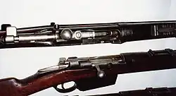 The Mauser Models 1884 "Artillery & Cavalry Carbine" were produced in 1884 in 4,000 units each at the Oberndorf plant for the use of the Serbian cavalry and Artillery.[3] They were based on the M71/84 and had a five-round tubular magazine.[3] By 1914, only 126 Cavalry & 815 Artillery models were left in the military's possession. In 1937, all remaining Model 1884 carbines were converted to the 1870s vintage 11×59mmR Gras cartridge, which was in good supply in Yugoslav Army depots after the Balkan War.[4]