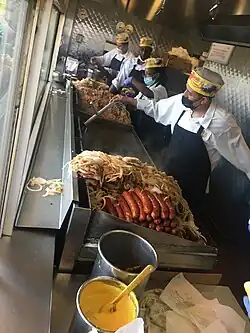 A Maxwell Street Polish consists of a grilled or fried length of Polish sausage topped with grilled onions and yellow mustard and optional pickled whole, green sport peppers, served on a bun. The sandwich traces its origins to Chicago's Maxwell Street market, and has been called one of "the classic foods synonymous with Chicago".[1]